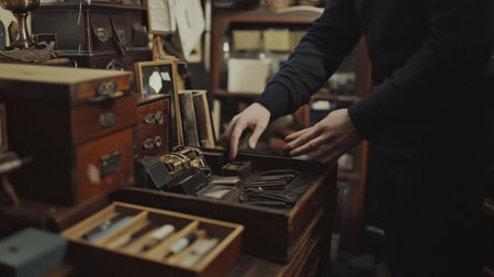 Antique furniture and collectibles arranged in a shop, creating a rich and historical ambiance.