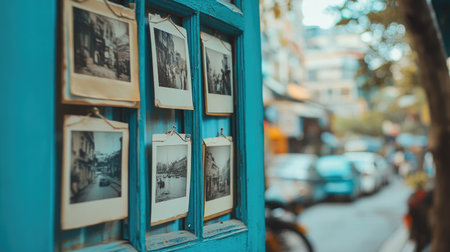 A collection of vintage photographs pinned to a vibrant blue wall, with a soft focus view of an urban street, evoking nostalgia and charm.