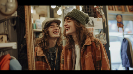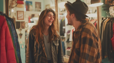 In the crowded city store, under the dim street lights, a man and a woman exchange smiles, creating an artful moment of connection. AIG41
