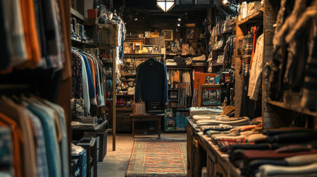 Explore a cozy vintage clothing store filled with colorful garments and a warm atmosphere. The interior features rustic shelves and carefully arranged merchandise, showcasing a unique shopping