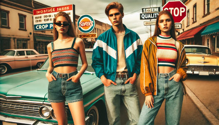 Stylish group of trendy teens showcasing vibrant 80s-inspired fashion.
