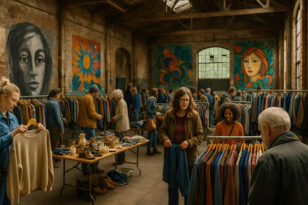 Shoppers searching for secondhand clothing at an indoor thrift store pop up event, promoting sustainable fashion and circular economy