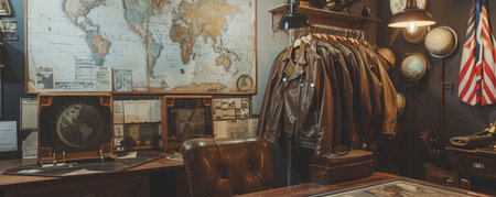 Vintage planetary exploration club, leather jackets, map room with alien charts