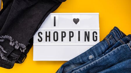 lightbox with text i love shopping with jeans around on yellow background , shopping black friday sale concept, big sale,