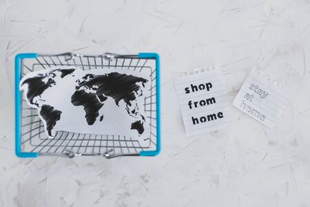 helping businesses after the global lockdown caused by covid-19, shopping bags and world map with Shop from home and Stay Home message