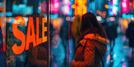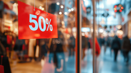 Vibrant red '50Discount' tag on a store window, surrounded by blurred shoppers, perfect for holiday and Black Friday promotions.