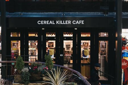 London, UK - November 26, 2019: Facade of Cereal Killer cafe in Camden, London, in the evening. Cereal Killer is the Worlds first International Cereal Cafe.