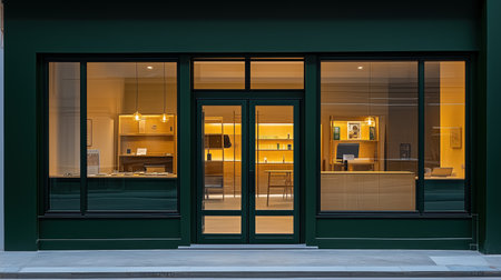 Generative AI : Storefront with black glass wall and double white door on right hand side