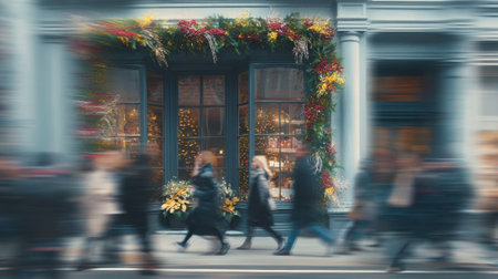 Medium shot of a festive winter window display with vibrant décor sharply focused soft blurred shoppers passing by to evoke seasonal holiday cheer.