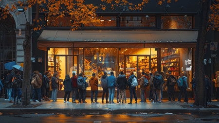 Gentle glow of lights welcomes guests to an inviting cafe on a lively city street.
