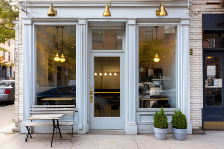 An exterior daytime view presents a cafe with a wooden door, surrounded by large glass windows. The building features visible business signage above the entrance. The composition and lighting suggest a welcoming atmosphere, suitable for various commercial uses. The scene could be utilized for editorial content or advertising purposes.