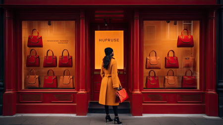 A solo shopper stands outside a luxury boutique holding bags in vivid shades of red and yellow. Her happiness radiates from the frame clearly having had a successful shopping adventure.
