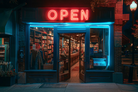 The inviting glow of neon lights beckons passersby to explore a charming bookstore, showing off its vibrant collection of books. It