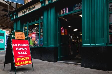 Dublin, Ireland - February 16, 2019: Closing Down Sale - Prices Slashed - No reasonable offers refused - Last day to day - on a street sign outside a city center store on a winter day
