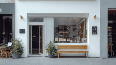 Chic and modern coffee shop exterior with a white-painted wall, elegant glass doors, and a wooden bench for outdoor seating.