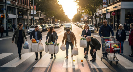 A group of individuals walks down a city street, each carrying shopping bags from various retailers in the United States, taking advantage of discounts on Labor Day.
