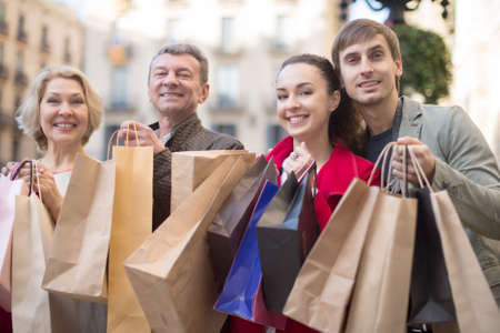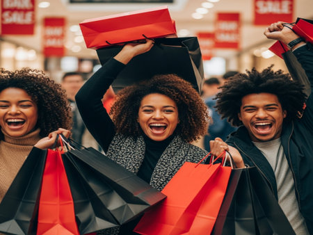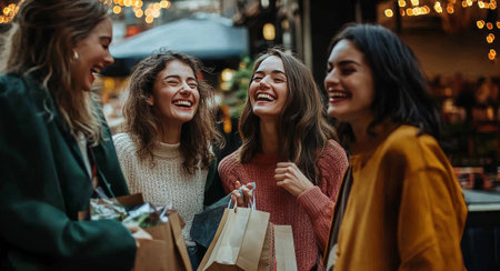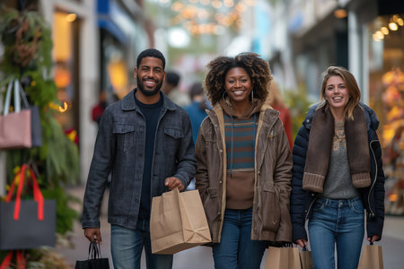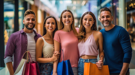 Generative AI : Group of friends holding Christmas gifts and bags in a shopping day