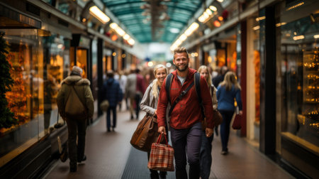 Captivating image of a cheerful young couple walking through a vibrant shopping mall adorned with holiday decorations in Germany, embodying the joyous spirit of urban Christmas shopping.