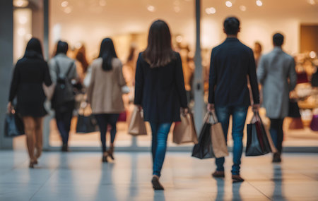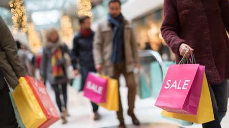 This image captures the vibrant atmosphere of a bustling retail space, showcasing hands holding colorful shopping bags filled with purchases. The blurred background enhances the lively shopping experience, highlighting the joy and excitement of consumers in a festive setting.