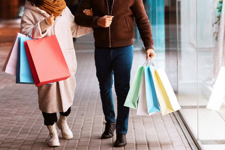 shopping and season sale. cropped shot of man and woman with multiple bags in hands.