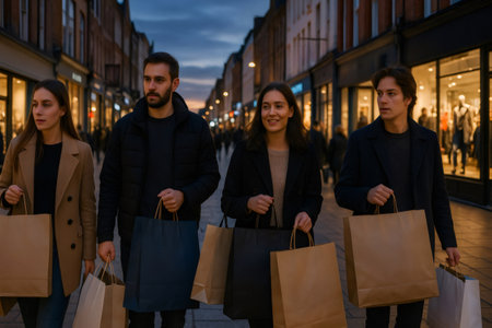 Four friends are walking down a city street at dusk, carrying shopping bags and enjoying their purchases