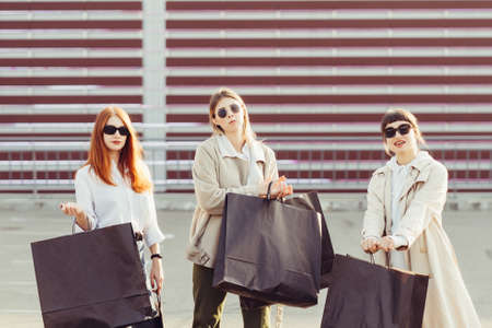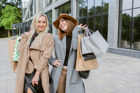 Portrait of two young friends enjoying doing shopping together outdoors. Friendship and shopping concept.