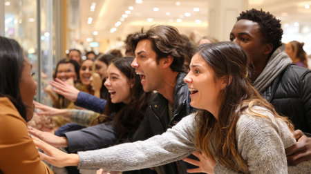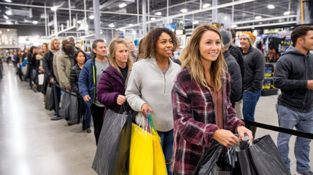 Line of people queued up in line, waiting to buy in a shop, store discounts