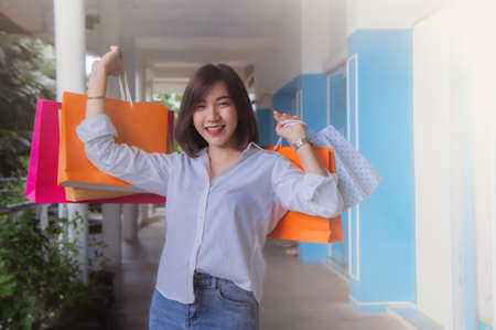 happy women and joyful and exciting in shopping mall center, buying and shopping consumerism with many bags holding in both hands