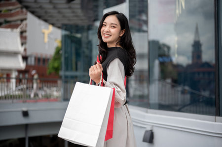 Smiling asian woman or female office worker standing outside a shopping mall while holding red white paper bags. Urban life.