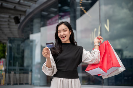 Asian woman or female office worker standing outside mall carrying shopping bag looking at credit card. Cashless payment, Urban life.