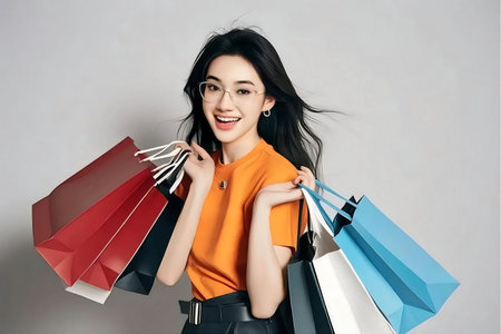Cheerful asian woman holding lot of shopping paper bag with one hand.