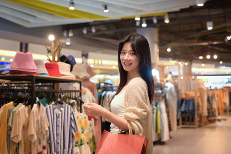 Beautiful asian female customer enjoy shopping in a local boutique store. Supporting local businesses.