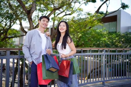 Beautiful young couple enjoying in shopping, having fun together, Portrait of beautiful smiling young couple standing in park after shopping.