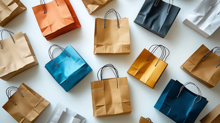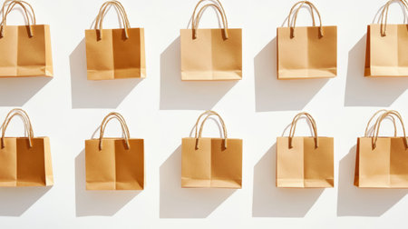 A visually appealing arrangement of brown paper bags against a clean white background, showcasing minimalism and eco-friendly shopping concepts, ideal for retail promotions.