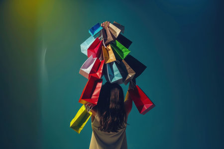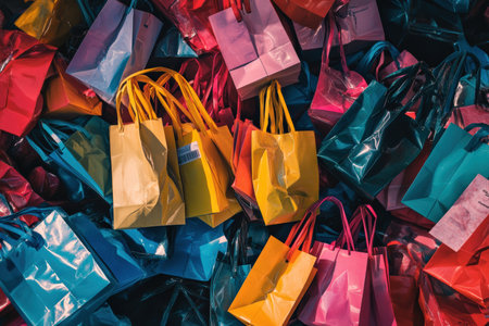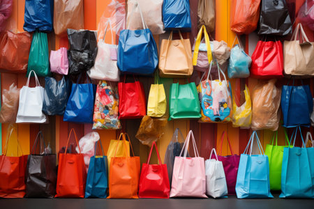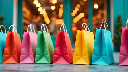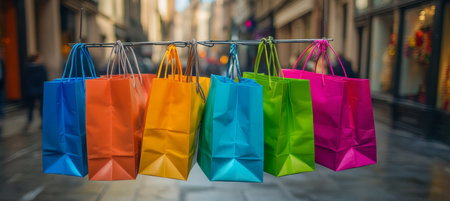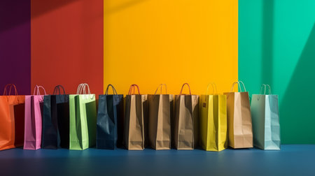 Vibrant shopping bags stand against a colorful backdrop, symbolizing retail therapy, consumerism, and the excitement of purchasing