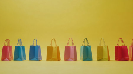 A vibrant array of shopping bags in various colors is lined up against a sunny yellow wall, showcasing a cheerful retail atmosphere perfect for shopping interests.