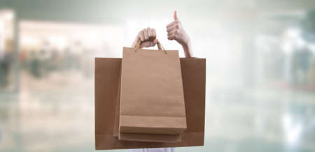 female hand holds a paper disposable bag with handles for groceries and clothes. Recyclable packaging. Zero waste. Sale banner
