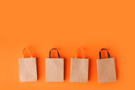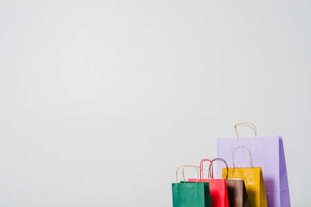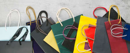 It's shopping time. Urban consumerism. Paper bags row on desk. Copy space on grey background.