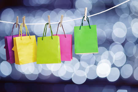 Colorful paper shopping bags with bokeh background. 3d rendering.