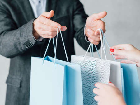 Close up shot of female and male hands holding black paper bags after doing shopping together isolated over light background