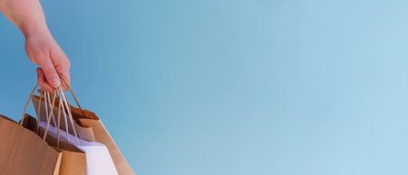 Hand with white paper bags and craft on bright blue background. Season of sales or purchases as gift for holidays.Christmas shopping. Courier delivery of products in eco-friendly packaging. copy space