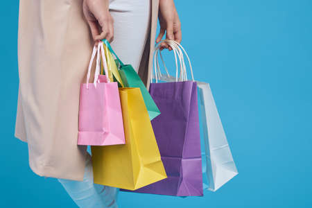 Woman shopping. Female casual lifestyle. Assortment of paper bags in hands. Cropped shot.