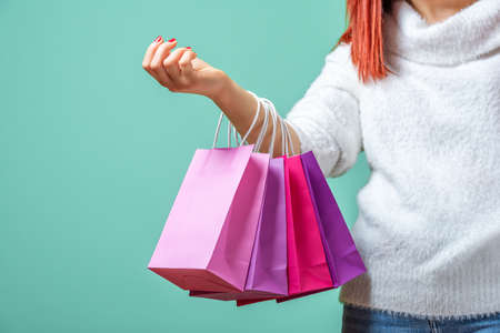 Woman holding in hands many multicolored paper bags with purchases in store closeup