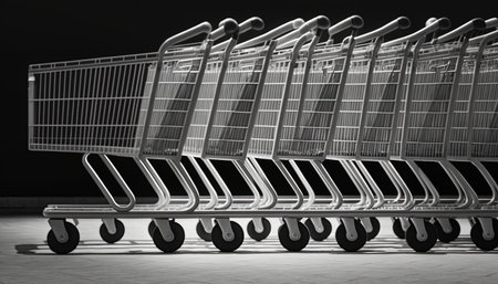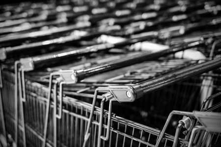 Row of supermarket shopping cart trolleys, black and white industrial metal background