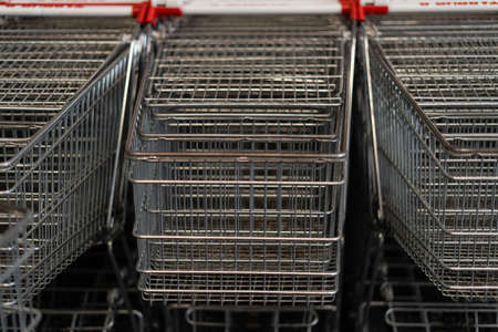 Lots of empty shopping carts in a row. concept buyer in super market. Metella Products
