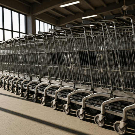 queue of shopping carts in a shopping mall
