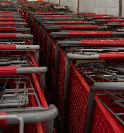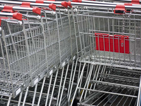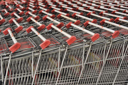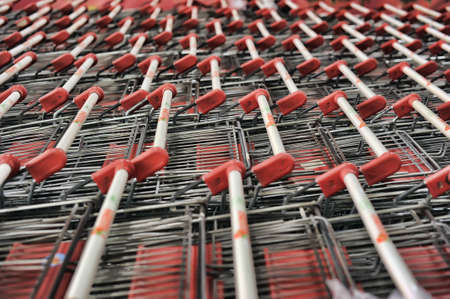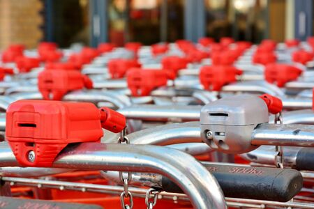Parking trolleys with red handles at the supermarket environment. High resolution image gallery.