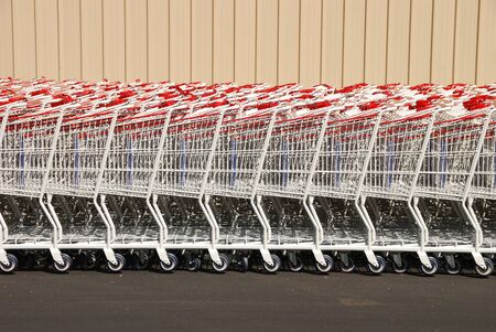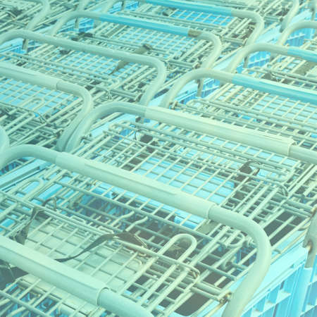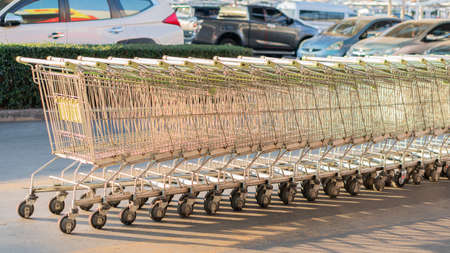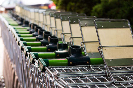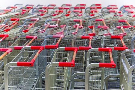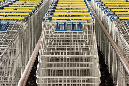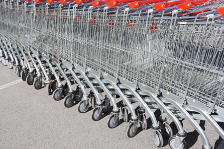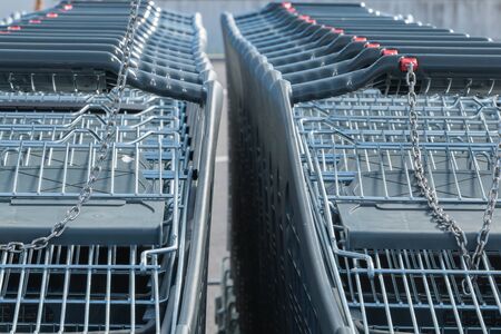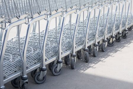 Row of supermarket shopping carts or trolleys for shopping mall background