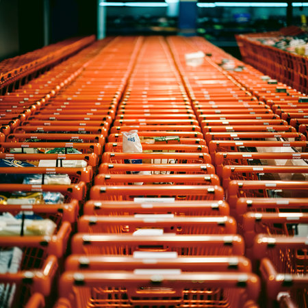 Row of carts standing inside the store before opening. generative AI