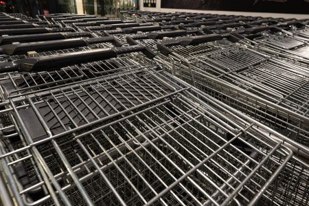 metal shopping carts at the entrance of supermarket